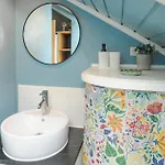 Zur Ausstattung des Badezimmers gehören auch eine Dusche.